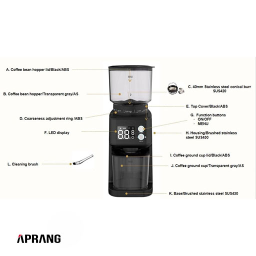 - مخزن 350 گرمی دانه قهوه به کاربر این امکان را میدهد که دانه های قهوه را در مقادیر زیاد آسیاب کند،به خصوص برای افرادی که قهوه زیادی مصرف میکنند و برای مهمانی ها.